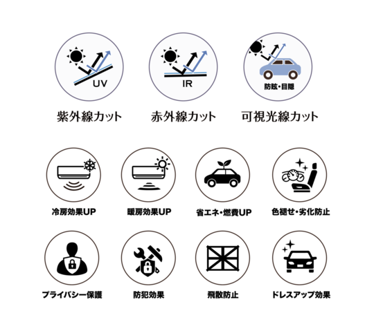 カーフィルムは窓ガラスの内側に貼るフィルムで遮熱、断熱効果紫外線(UV)カット効果プライバシー保護があります。